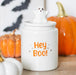 Keep your favourite Halloween treats away from naughty ghouls with this adorable ceramic storage jar. Features orange 'Hey boo!' text on a speckled white background with a charming ghost on the lid.