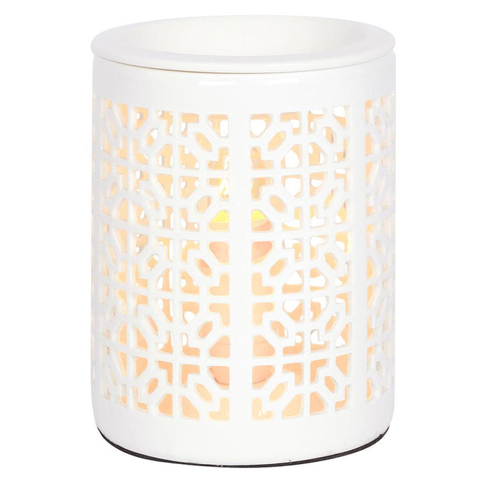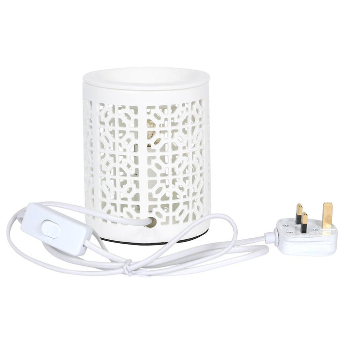 This elegant, electric oil burner lights up to showcase a detailed imperial trellis pattern and is compatible with both scented fragrance oils and wax melts. To use, place on a level and heat resistant surface before placing oil or wax melts in ceramic dish and plugging in burner.