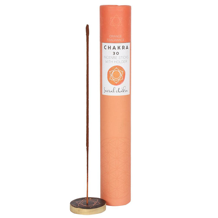 This pack of incense contains 30 incense sticks in an orange fragrance. The incense represents the Sacral Chakra which is linked to sexuality and physical grace. The pack comes with a wooden ash catcher showing the Sacral Chakra symbol.