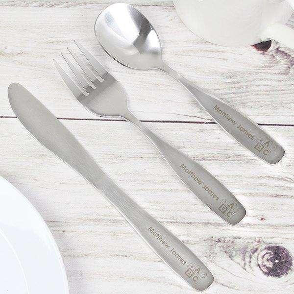 This stainless steel cutlery set can be personalised with any name up to 15 characters.