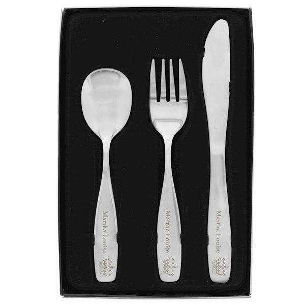 This stainless steel cutlery set can be personalised with any name up to 15 characters.
