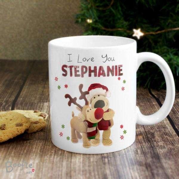 This 'Boofle' Christmas Reindeer Mug can be personalised on the front with 2 lines of text up to 15 characters per line (the 2nd line will appear in UPPERCASE). The reverse of the mug can be personalised with a message over 5 lines of text with up to 20 characters per line.