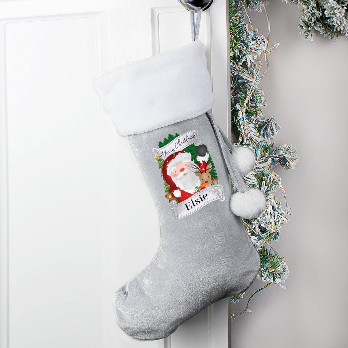 Personalised Silver Grey Velvet Christmas Stocking - Santa & Rudolph