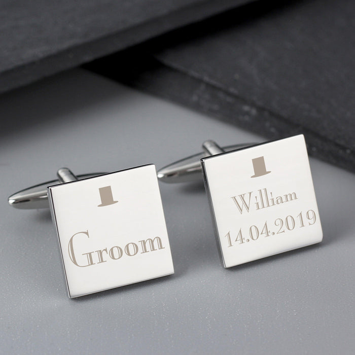 Personalise these Decorative Wedding Groom Square Cufflinks with a name up to 9 characters and a date up to 10 characters.