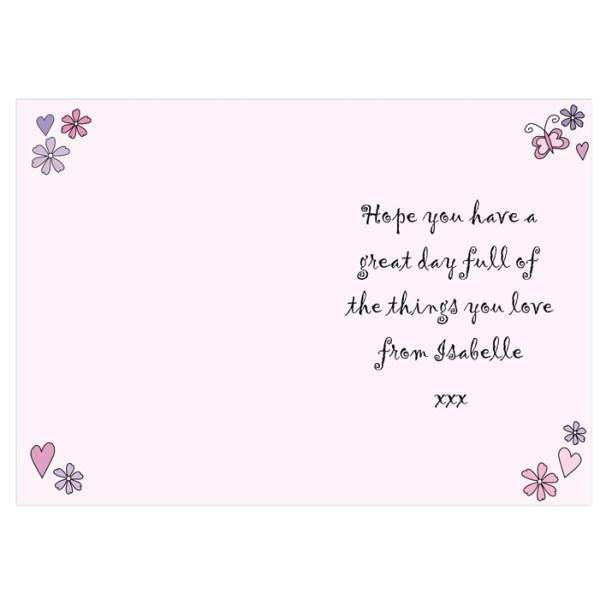 Personalise this Happy Mothers Day Flowers Card with a name of up to 12 characters and a message of up to 20 characters on the front.