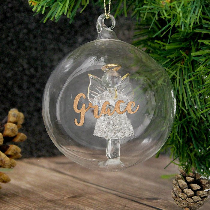 This stunning hand-blown glass angel Christmas tree bauble can be personalised with any name in elegant gold glitter font. It's a perfect way to honour and remember a loved one during Christmas.