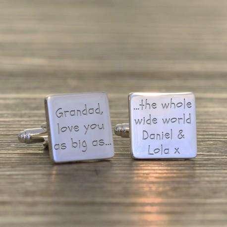 One cufflink will be engraved 'Grandad love you as big as...' the other is engraved 'The whole wide world'. Just add a name of your choice to complete these special cufflinks.