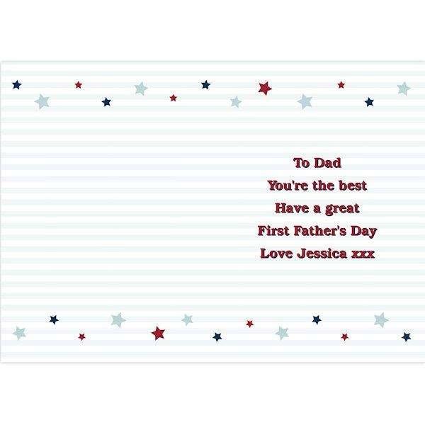 The card can be personalised on the front with a date/year/name up to 10 characters and then a message over 2 lines up to 20 characters per line. The words 'Happy 1ST FATHER'S DAY' are fixed. You can then personalise the inside of the card with 5 lines of text up to 25 characters per line.
