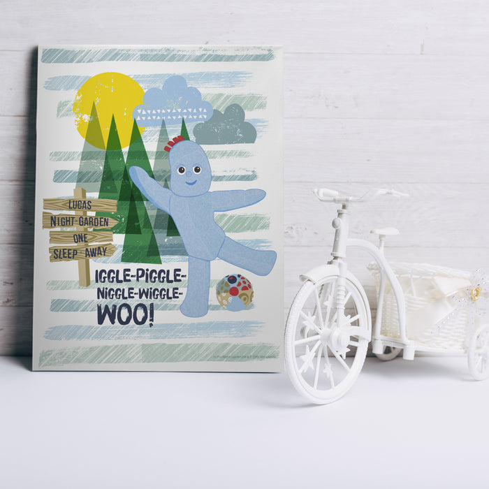 This colourful 40cm x 30cm canvas can be personalised with a name of up to 15 characters. The name will feature in the wooden sign next to Iggle Piggle above the fixed text ‘Night Garden One Sleep Away’.