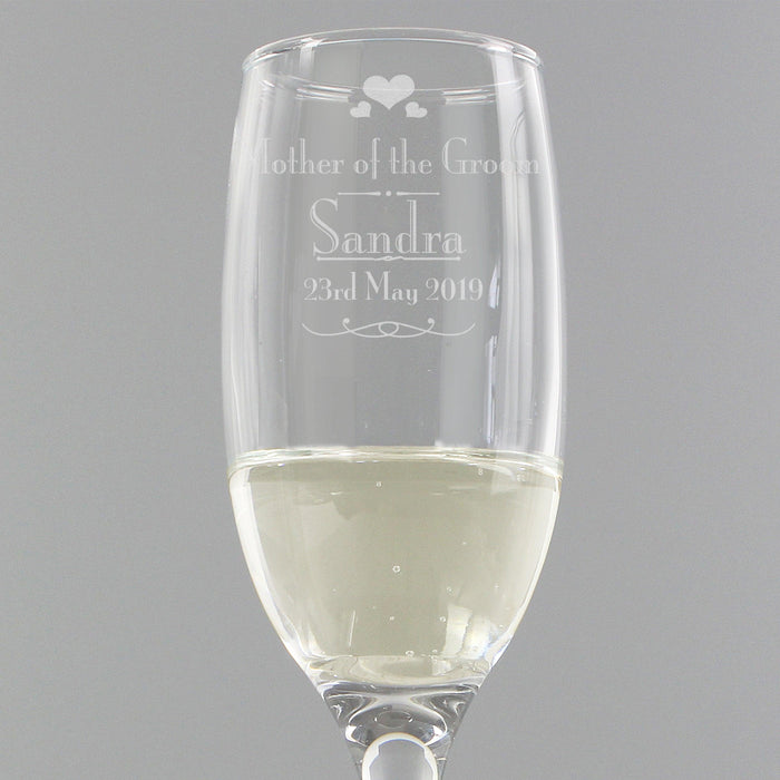 Personalise this Mother of the Groom Champagne Glass Flute with a name (to appear in uppercase) up to 12 characters and a date up to 20 characters.
