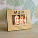A high quality finish oak veneer wood frame. The top is engraved with "Mum I (heart) you" the bottom of the frame is left free for your own personalised message up to 120 characters, 3 lines 40 characters each line