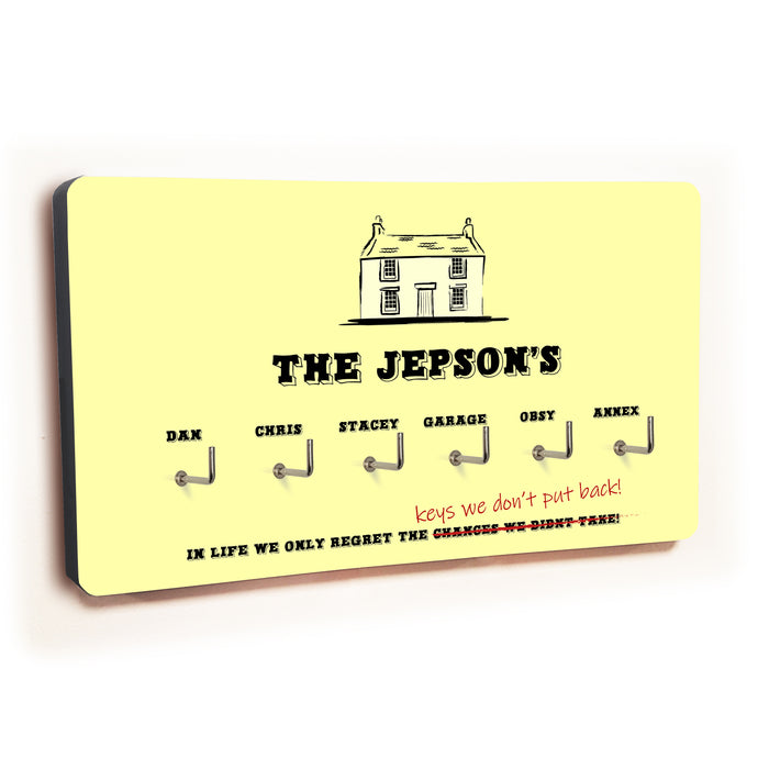 Personalise this Yellow 6 hook key hanger with House design by adding a title, such as you family name and what is to be hung on each hook.
