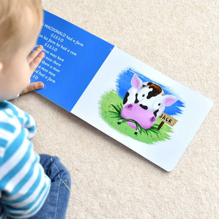 The personalised cover has a sound button which sings the song, including fun animal noises. Toddler books are written to be read out loud, but these books go one step further with the song playing for toddlers to sing along. Recognising the look of words and matching sounds to them helps growing minds to learn reading skills and gives them a great head-start in life. With their name on every page, your child will love engaging with this book, which has been made especially for them. Can they spot their name hidden in the colourful pictures?