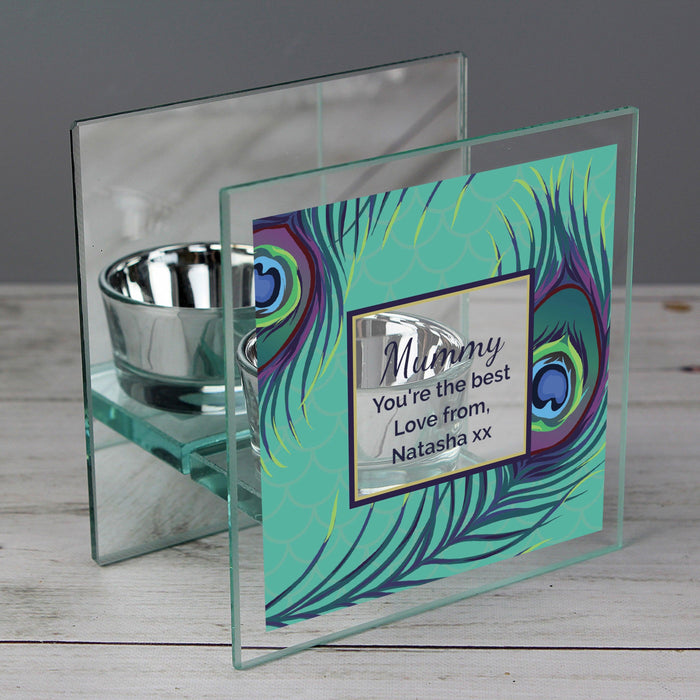 Personalised Peacock Mirrored Glass Tea Light Candle Holder