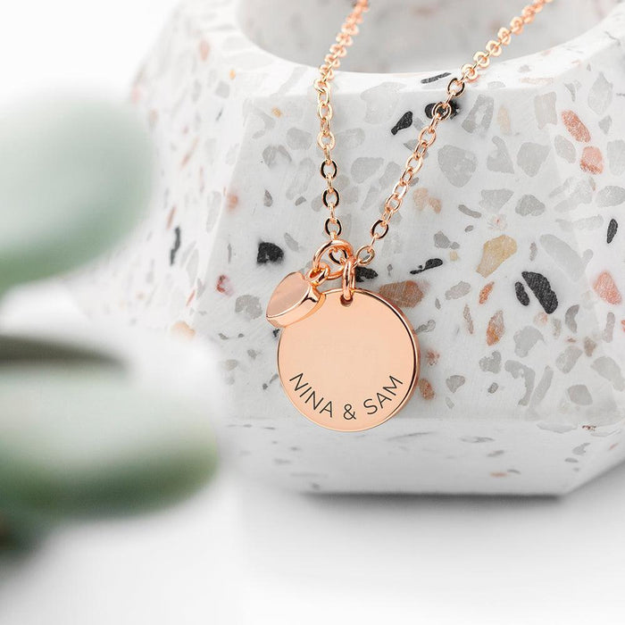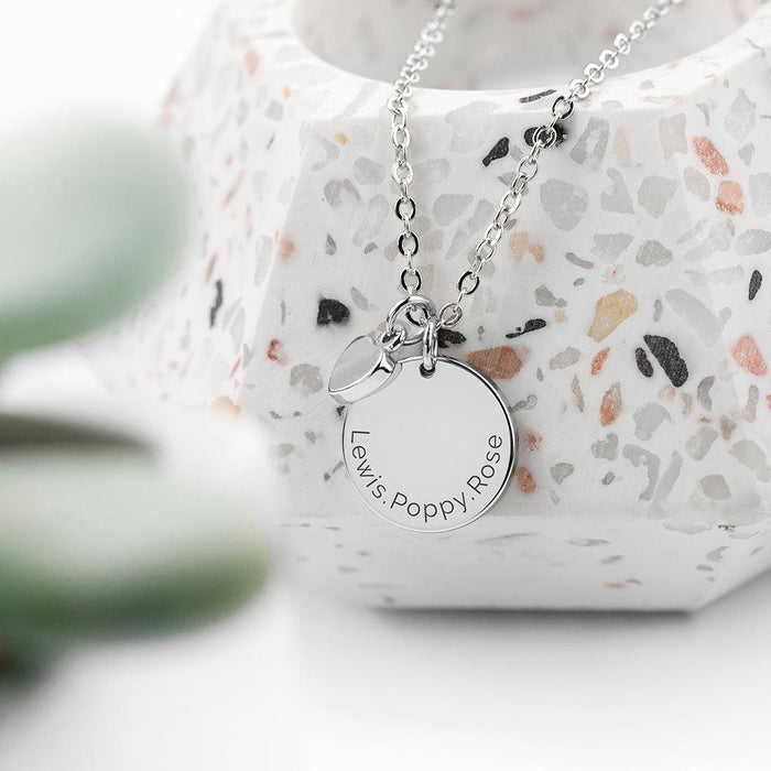 Part of our new designs of beautiful but simple jewellery. This polished necklace features a cute little heart charm and a disc necklace that you can personalise with the names of the members of your family (up to 25 characters). You can also request a small message instead.