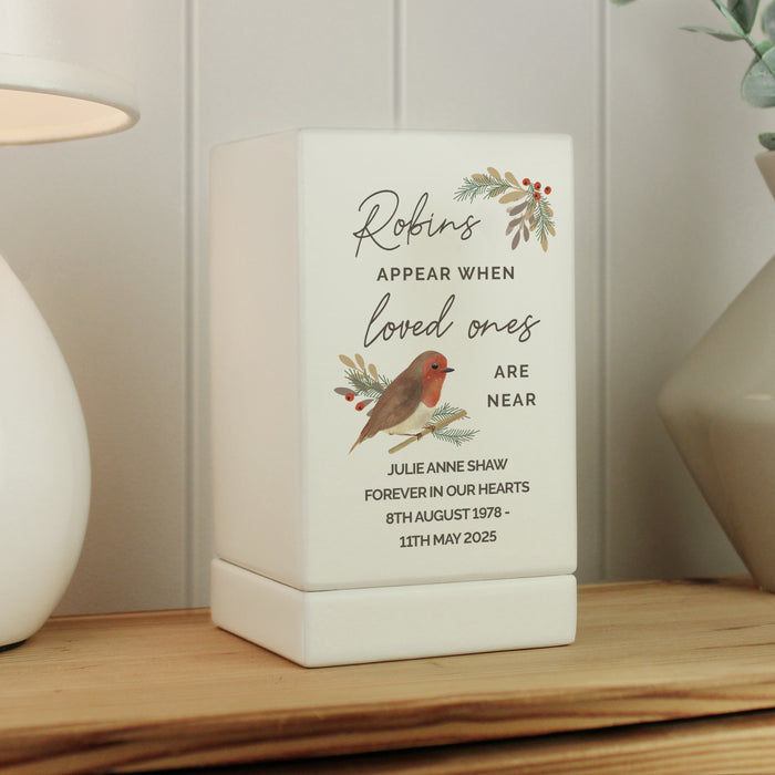 Keep the memory of your loved one close with our Personalised Robins Appear Small Wooden Urn.