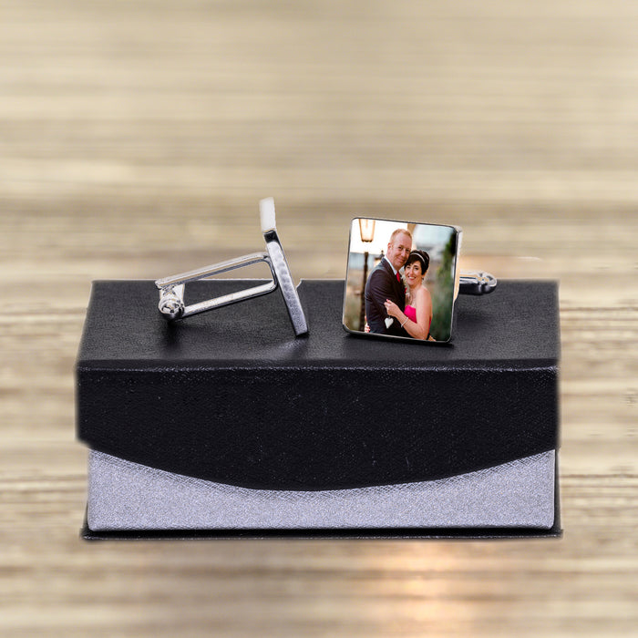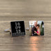 High quality silverplated square cufflinks. Personalise one cufflink with a date and a message up to 20 characters, the other with a photo of your choice. Set out in a simple but classic style.