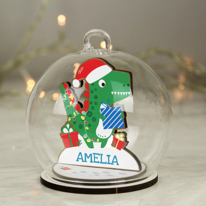 This Personalised Dinosaur Glass Bauble adds a personal touch to the Christmas tree. This bauble is made from glass with a wooden base and shape inside of the bauble.