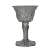 This silver metal chalice features a handcarved om symbol design and twisted vine accent along the stem.