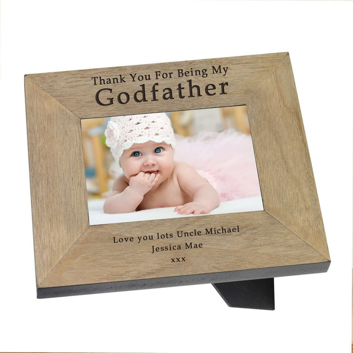 A high quality finish oak veneer wood frame. The top is engraved with "Thank you for being my Godfather" and the bottom of the frame is left free for your own personalised message.