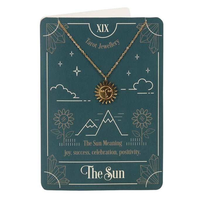 A mystical gold-tone sun necklace beautifully presented on a matching greeting card perfect for gifting. Inspired by the art of tarot reading. 22cm chain with lobster clasp closure. Nickel-free stainless steel. Includes metallic envelope. Card left blank inside for your own message.