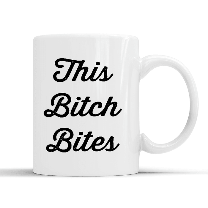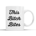 Rude, offensive mug with This Bitch Bites printed on both sides. This rude and offensive mug is great as a gift for any occasion.