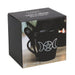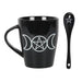 Black ceramic mug and spoon set with a Pentagram design. Dishwasher and microwave safe.
