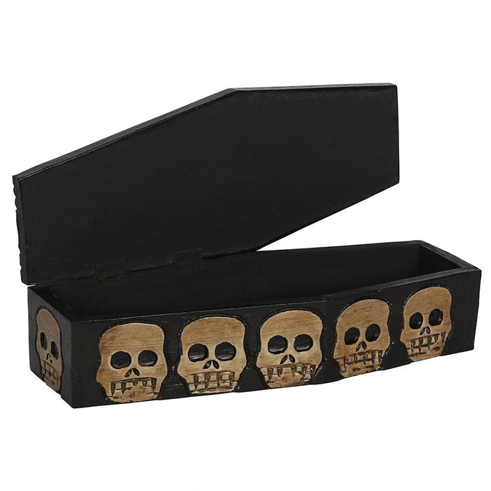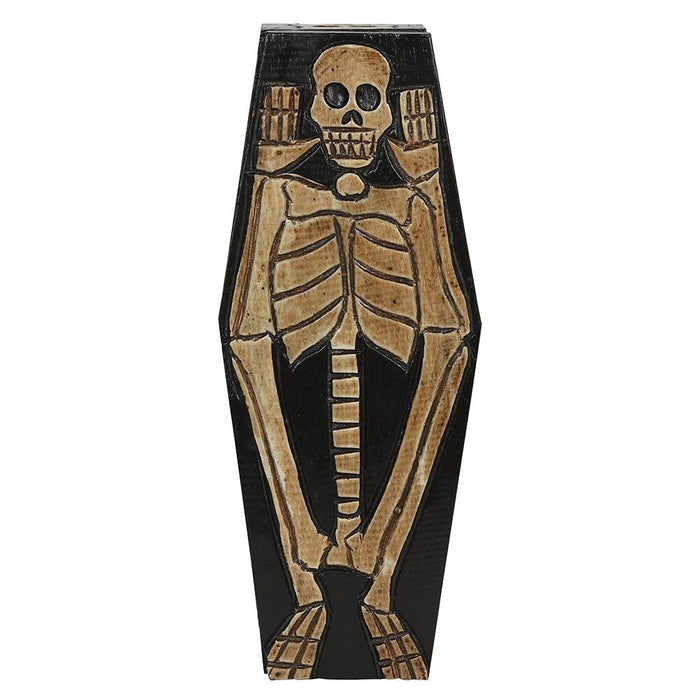Shaped like a coffin and features rustic, handcarved skeleton and skull details.